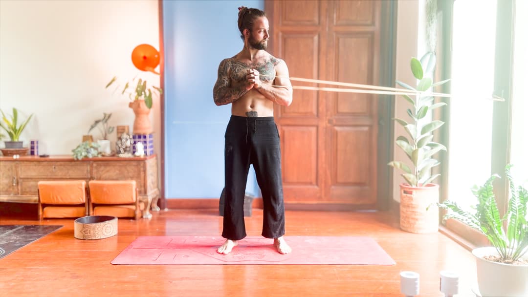 This movement combines a foundational squat with a Pallof press rotation to train full-body coordination, lower-body strength, and controlled anti-rotation. Holding a band anchored to the side challenges the trunk to stay organized as the legs produce force. Lower into a controlled squat, then as you stand, press the band forward and rotate the rib cage away from the anchor while keeping the pelvis stable. The spine stays long, ribs stay contained, and the movement remains deliberate. If you feel this in the lower back, shorten the press or slow the tempo. This is strength with restraint, not speed or force.
