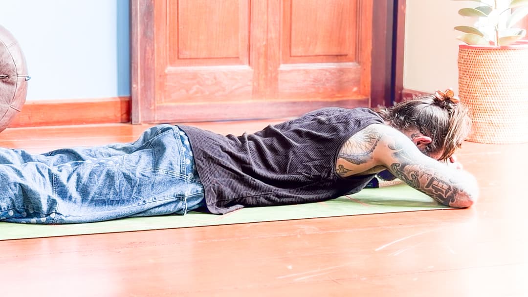 Crocodile breathing is a simple yet powerful drill for restoring healthy breathing mechanics and nervous system regulation. By lying prone and allowing the belly and ribcage to expand against the floor, this exercise encourages diaphragmatic breathing and reduces unnecessary tension through the neck, shoulders, and lower back. In this variation, focus on slow nasal breathing, expanding the belly and ribcage outward with each inhale, and allowing a gentle release with each exhale. This breathing pattern helps establish a calm baseline before movement practice, improves ribcage mobility, and supports better core function throughout the rest of the session.