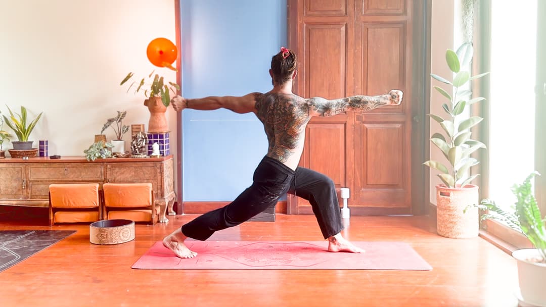 This reverse lunge variation integrates lower-body strength with spinal rotation and upper-body coordination. Stepping back into a tall lunge creates stability, while the overhead reach and open twist encourage space through the torso. Rotate smoothly toward the forward leg, keeping the spine long and the hips level. Avoid rushing, narrowing the stance too much, or collapsing forward during the twist. Intentional breathing helps organize the movement, and light dumbbells can be added for extra load if desired. Move slowly, stay balanced, and let the twist feel expansive rather than forced.
