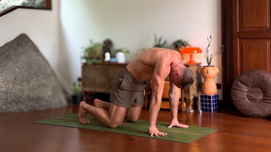 A quick-moving class that opens the spine, strengthens the legs, and sharpens balance. Chair, revolved lunge, half moon, and dragon squat form the backbone of the sequence. The latter portion focuses on bridge or wheel, deep hamstring and hip openers, and a restoring savasana. Class Outline: - Seated arrival - Cat cow - Thread the needle - Wrist prep - Down dog - Forward fold - Standing twist - Lateral spinal waves - Chair pose - Revolved high lunge - Down dog twist + reverse side plank option - Extended side angle - Half moon - Dragon squat prep - Malasana twist - Low boat chair flow - Active supine twist - Bridge pose - Wheel pose - Halasana variation - Figure 4 - One legged happy baby - Supine splits - Supine twist - Savasana